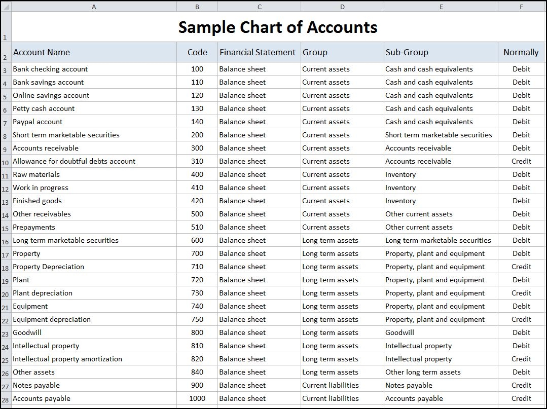 Sample Chart Of Accounts Template Double Entry Bookkeeping