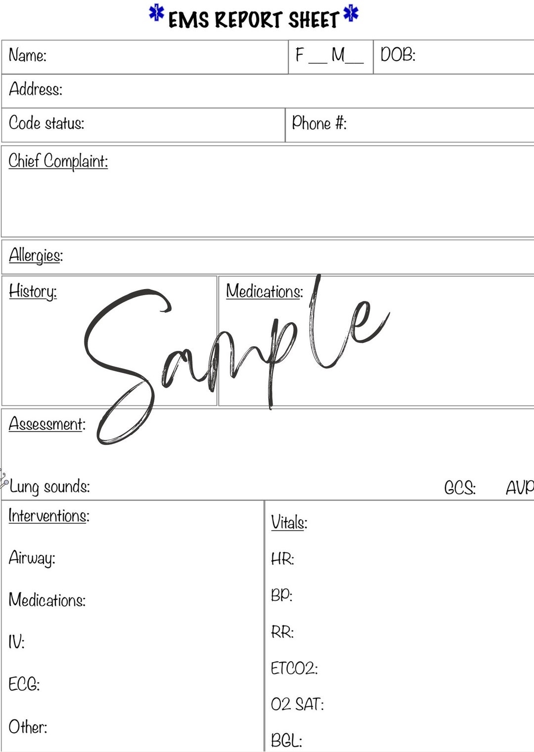 Paramedic EMS Printable PDF Report Sheet Emergency Medical Services PDF Download Emt Report Sheet Aemt Report Sheet Charting Template Etsy