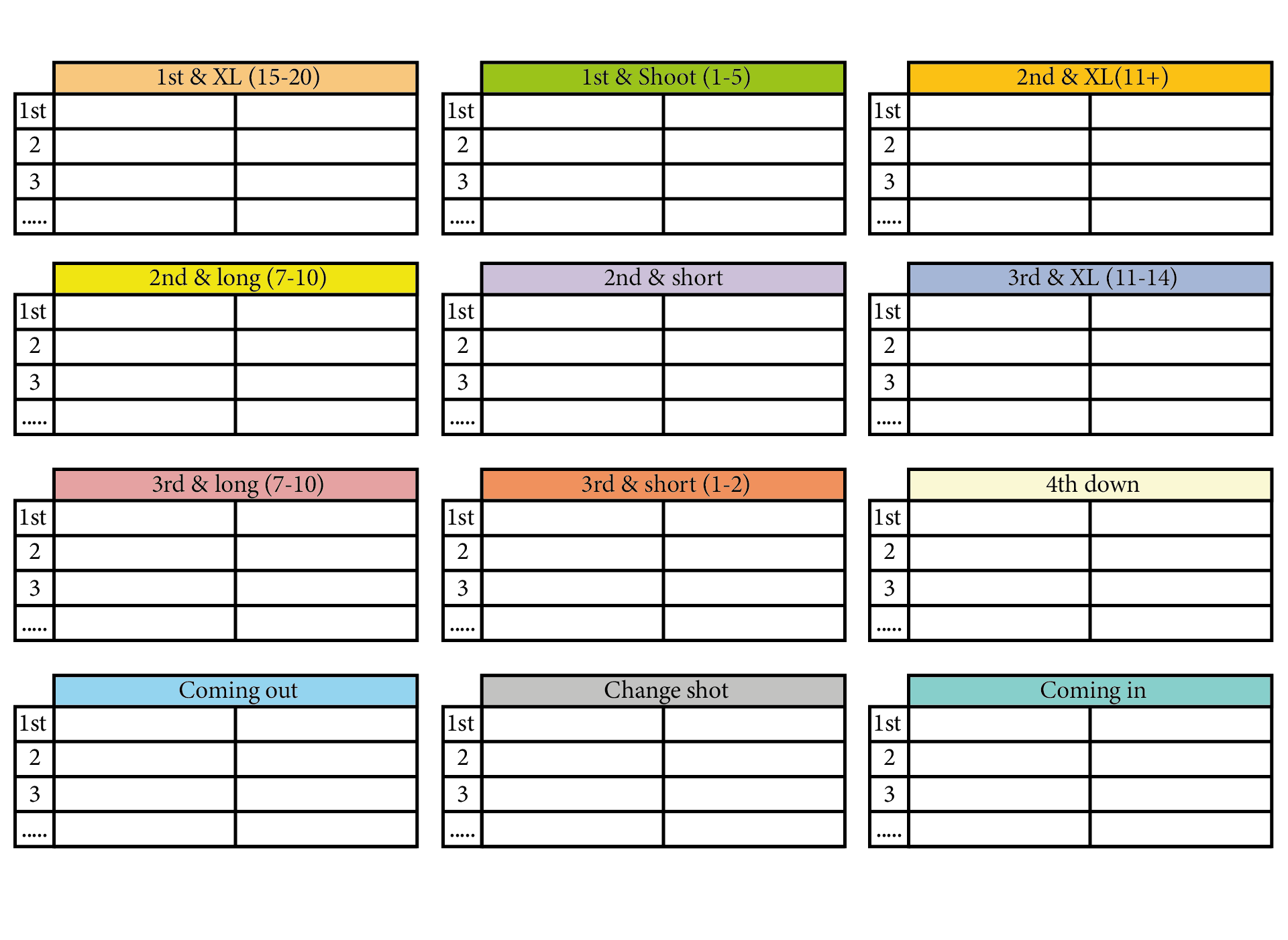 Include sections for offense, defense, special teams, and any other plays your team may need. Organize plays by down and distance to help players quickly find the right play for any situation.