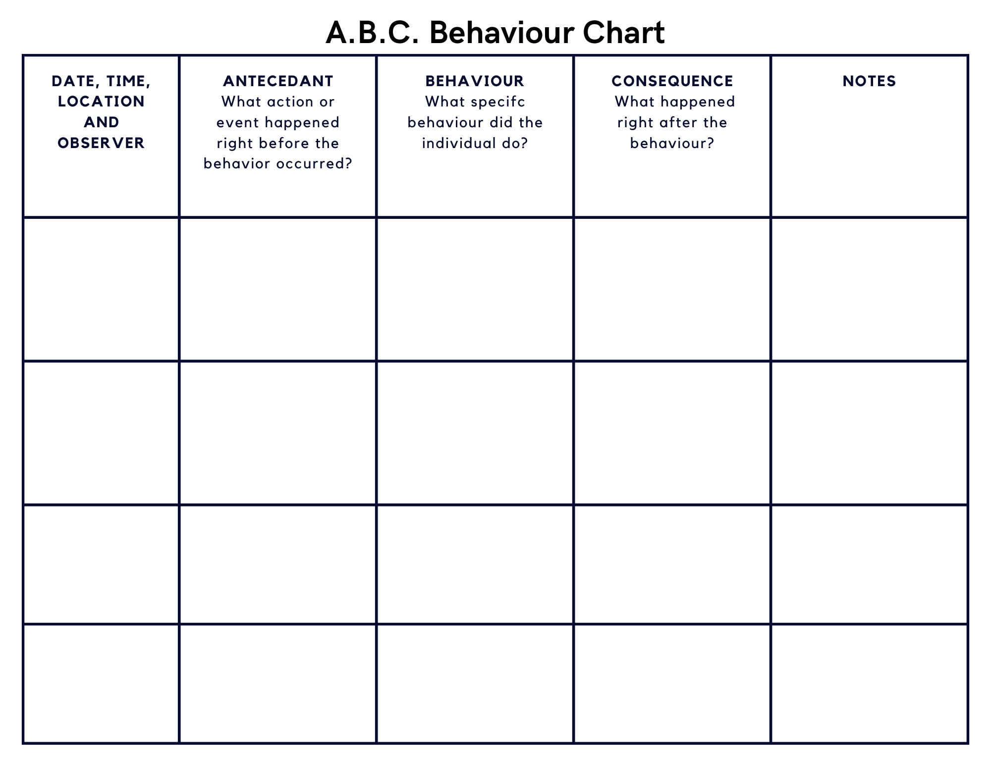 By consistently using an ABC chart, you can gain valuable insights into the factors that influence behavior. This information can help you develop strategies to support positive behavior change and create a more positive environment for everyone involved.