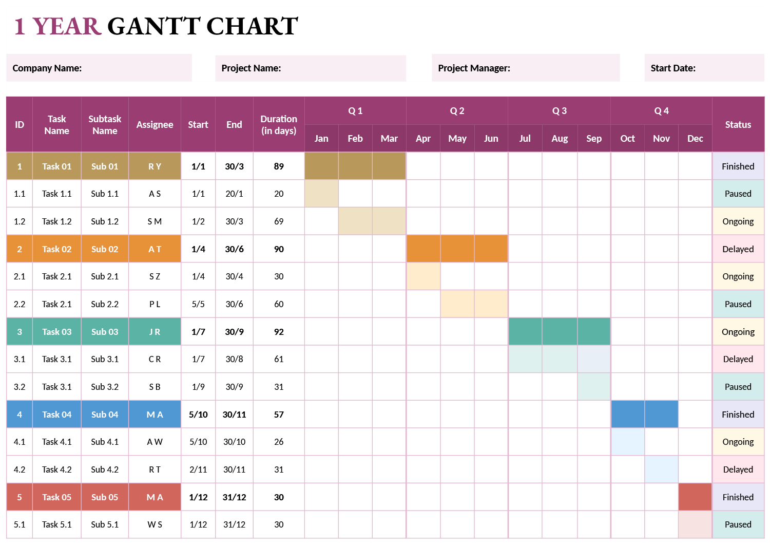 1 Year Gantt Chart Template Excel PowerPoint Highfile