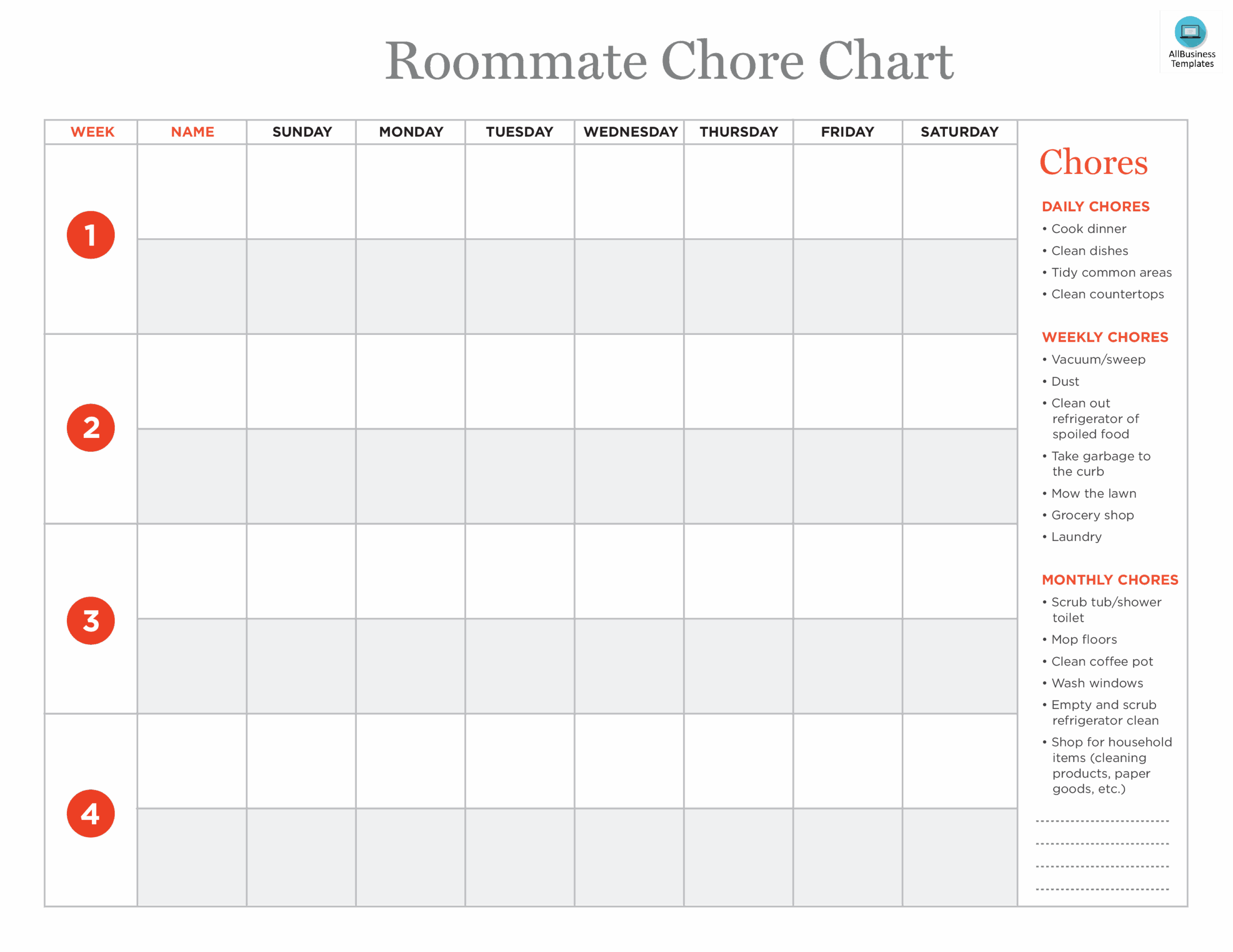 Roommate Chore Chart Template